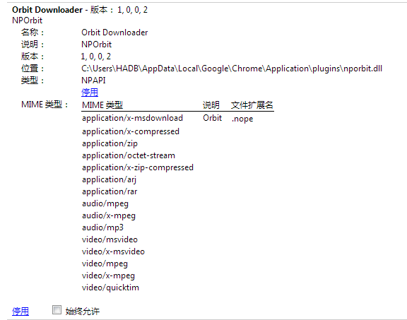 导致我一直以为我没有卸载 Orbit,后来我找来找去,都找不到 Orbit 的卸载文件,也找不到它的安装目录,我想,应该是卸载了的呀!后来一想,既然是在 Chrome 下出现问题,估计是插件的原因,于是在 Chrome 地址栏输入:chrome://plugins/进入 Chrome 的插件管理,果然发现一个 Orbit Downloader 的插件,如下图,停用,问题解决。